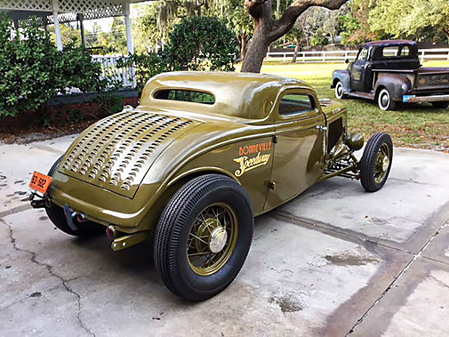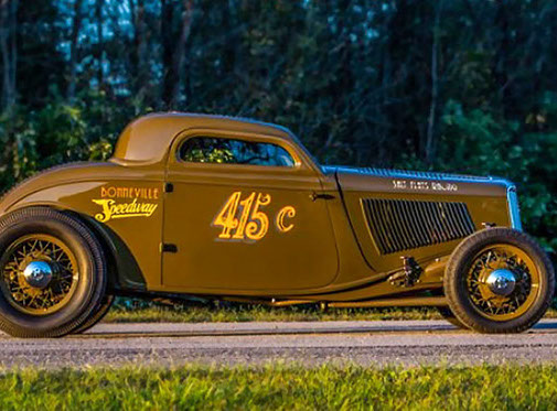 The Bonneville Salt Flats was the inspiration for this one of a kind fenderless Ford 3-window coupe that has been chopped and channeled. Performance comes from a 350 Chevrolet engine mated to a Tremec 5 speed transmission that drives a Winters Quickchange rear end. 1939 Lincoln brakes provide the stopping power. The hood, roof, deck lid and aluminum interior sport 525 louvers. Traditional 17 and 18 inch Ford wire wheels complete the Bonneville look. Finished in 1932 Harley Davidson Cactus green/clear color.
