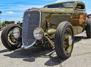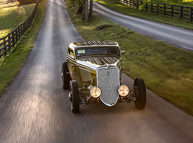 The Bonneville Salt Flats was the inspiration for this one of a kind fenderless Ford 3-window coupe that has been chopped and channeled. Performance comes from a 350 Chevrolet engine mated to a Tremec 5 speed transmission that drives a Winters Quickchange rear end. 1939 Lincoln brakes provide the stopping power. The hood, roof, deck lid and aluminum interior sport 525 louvers. Traditional 17 and 18 inch Ford wire wheels complete the Bonneville look. Finished in 1932 Harley Davidson Cactus green/clear color.