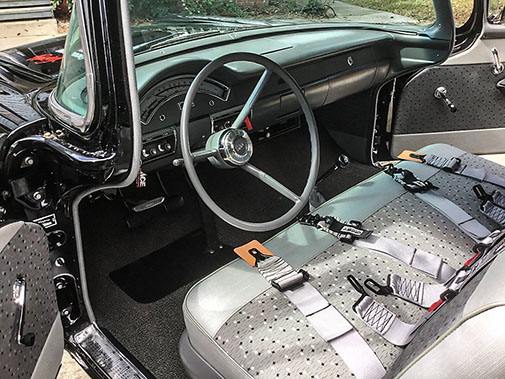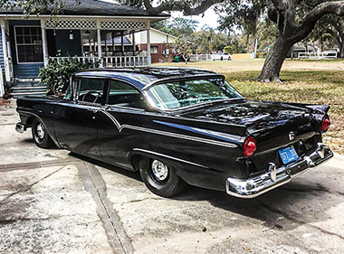 A true performance build that started with ‘57 Custom businessman’s coupe. An extremely rare car that came from the factory without a rear seat, heater and clock delete, stationary rear windows, single sun visor and one arm rest. This build was a real sleeper look that featured minimal stainless trim, dog dish hubcaps, original style interior and dash. Power is from a 428FE Ford engine with tripower and a 4-speed with a 9-inch Ford rear. Finished in a deep black base/clear over a rust-free laser straight body.